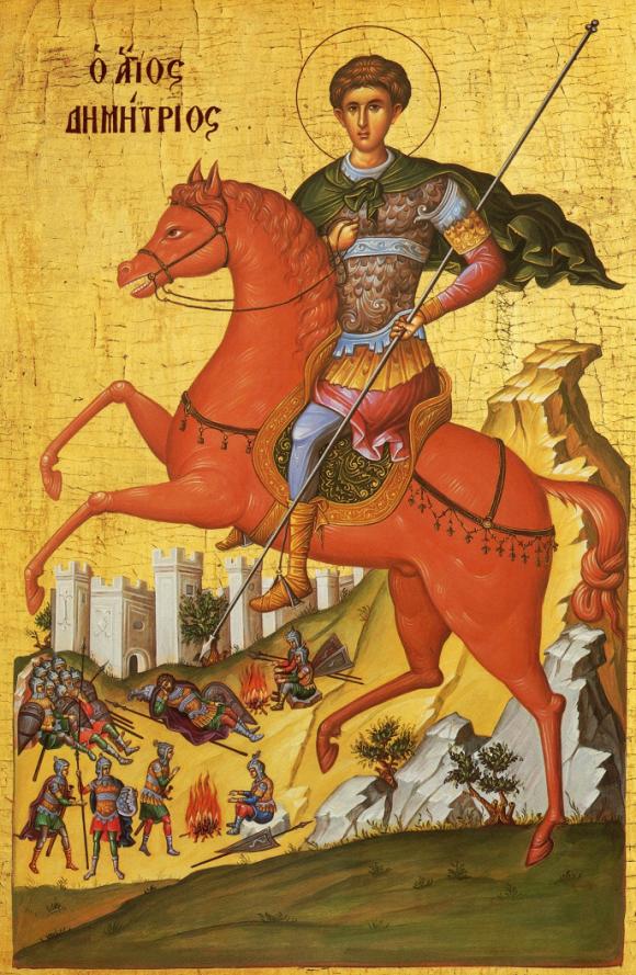 Procónsul romano, originario de Salónica, que vivió en tiempos del emperador Maxi-miano. Es poco lo que se sabe de su vida pero en el Oriente se lo venera desde antiguo y su fiesta se celebra con gran solemnidad. La tradición dice que fue ¨un guerrero de Cristo y un mártir militar¨. Se lo tiene como patrono y modelo de los soldados y de los caballeros. Su nombre (Dimitry - Dmitry) es muy popular entre los eslavos. Fue muerto a lanzazos por orden del emperador Maximiano.