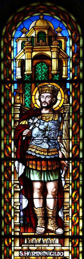 Hermenegildo y su hermano, Recaredo, eran hijos de Leovigildo, rey de los visi-godos en España. Fue educado en la herejía arriana. Hermenegildo se casó con Ingunda, ferviente católica, hija de Sigberto, rey de los francos. El ejemplo y las oraciones de su mujer, y la predicación de San Leandro, convirtieron a Hermenegildo a la fe católica. Al saberlo, su padre se enfureció y lo encarceló. En Pascua le envió a un obispo arriano, prometiéndole que lo perdonaría si aceptaba la comunión de manos del prelado hereje. Al saber que Hermenegildo se negó ordenó matarlo. Era el año 586. Antes de su muerte Hermenegildo pidió a su hermano Recaredo que se convirtiera y que cuando fuera rey condujera a la nación a la fe católica. Así fue como España se hizo católica y lo es hasta hoy.