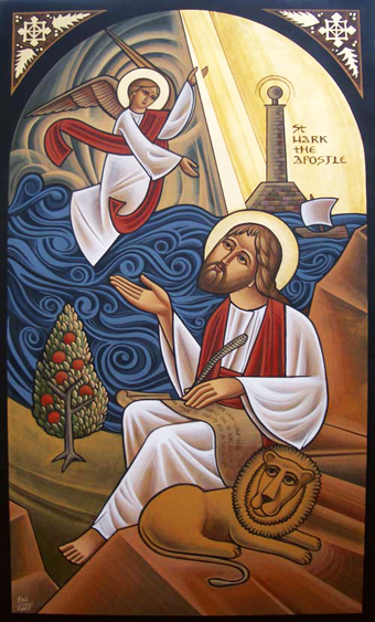 Fue uno de los 72 discípulos que seguían a Jesús y discípulo e intérprete de San Pedro. Su casa fue el Cenáculo donde Cristo realizó la última cena e instituyó la Eucaristía, y donde los apóstoles recibieron al Espíritu Santo el día de Pentecostés. Predicó el Evangelio en Chipre, en Asia Menor y en Alejandría de Egipto, que lo considera su apóstol y primer mártir. En esta ciudad murió posiblemente el año 68. Escribió uno de los cuatro evangelios. Su relato empieza por la misión de Juan Bautista, cuya ¨voz clama en el desierto¨. Se lo representa con un león, porque el león, según la visión del profeta Ezequiel, hace estre-mecer el desierto con sus rugidos. El cuerpo de San Marcos está en Venecia, ciudad que lo tiene por patrono.